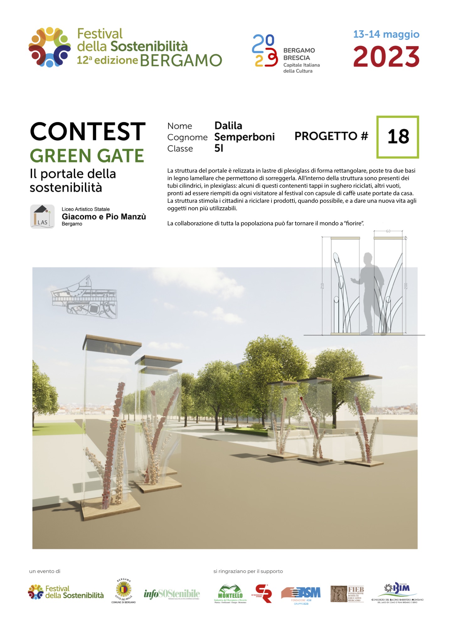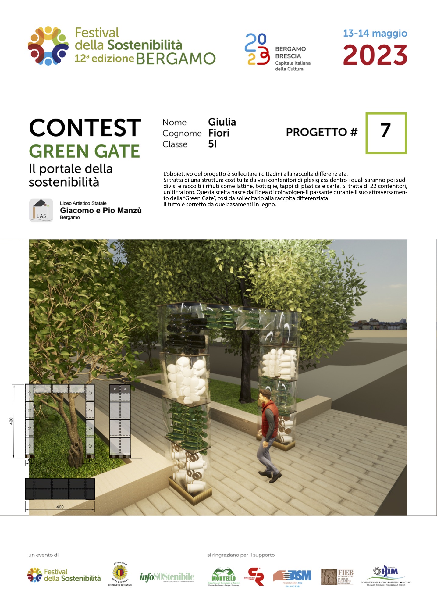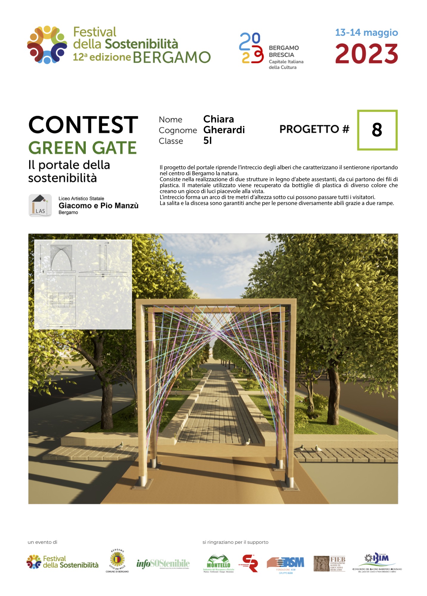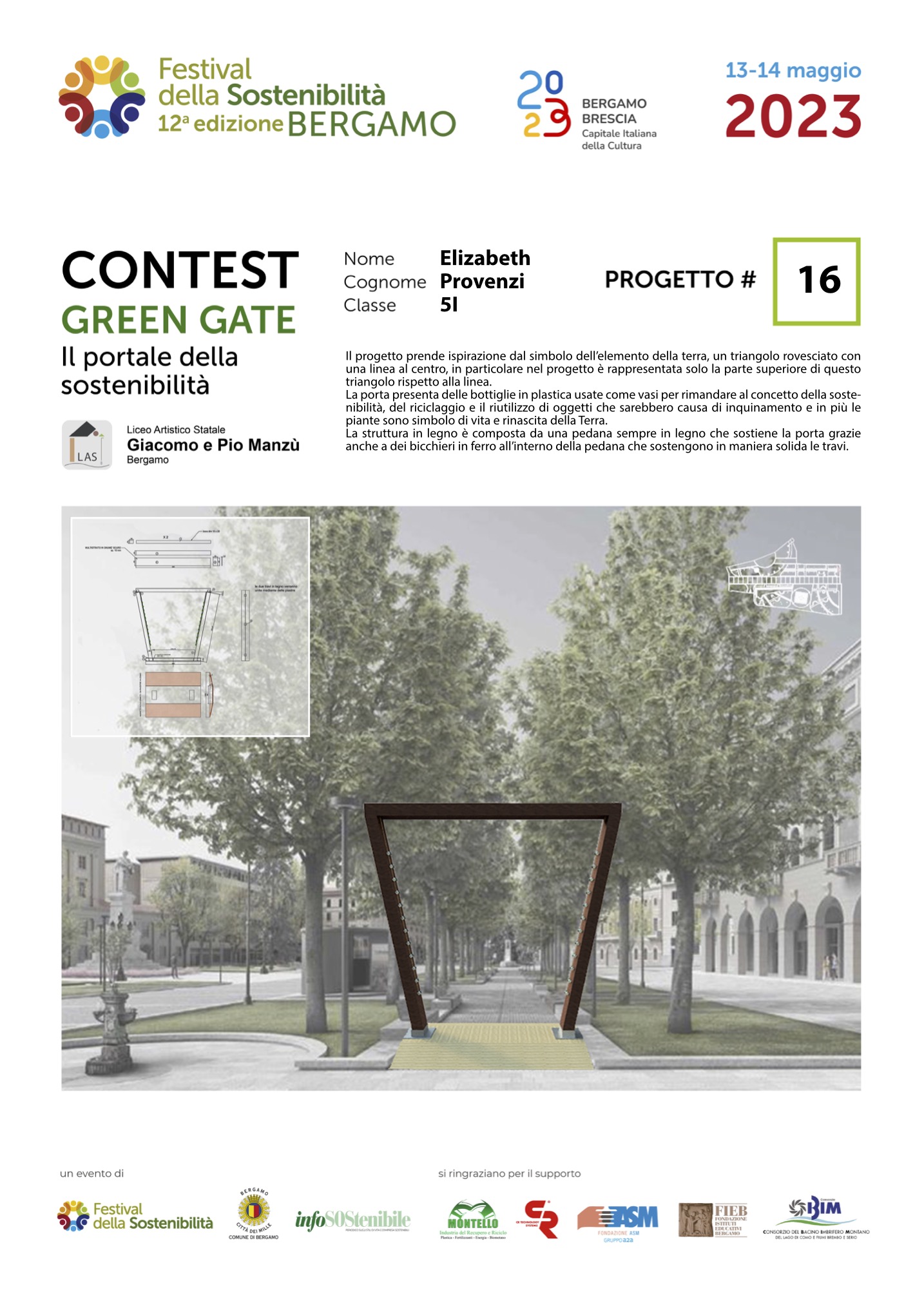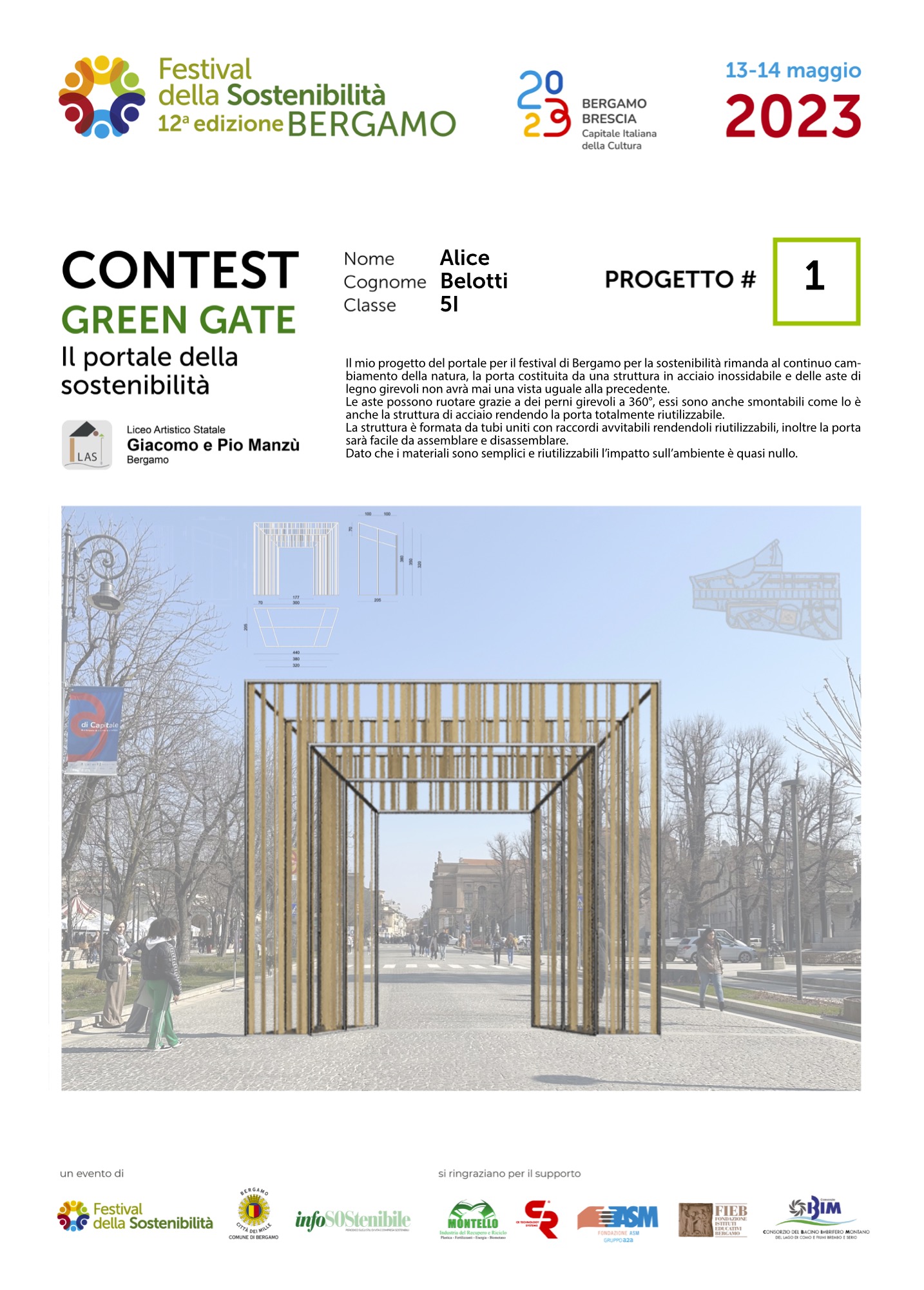 Gli studenti, come dei veri professionisti del settore, hanno concepito ciascuno il proprio Green Gate e, a partire dalla bozza iniziale, hanno sviluppato delle tavole esecutive che riportano la descrizione del concetto su cui si è costruita l’idea, la scheda tecnica e l’elaborato grafico. Le tavole dei progetti saranno esposte lungo il Sentierone durante il Festival e saranno gli stessi studenti a presentarli.