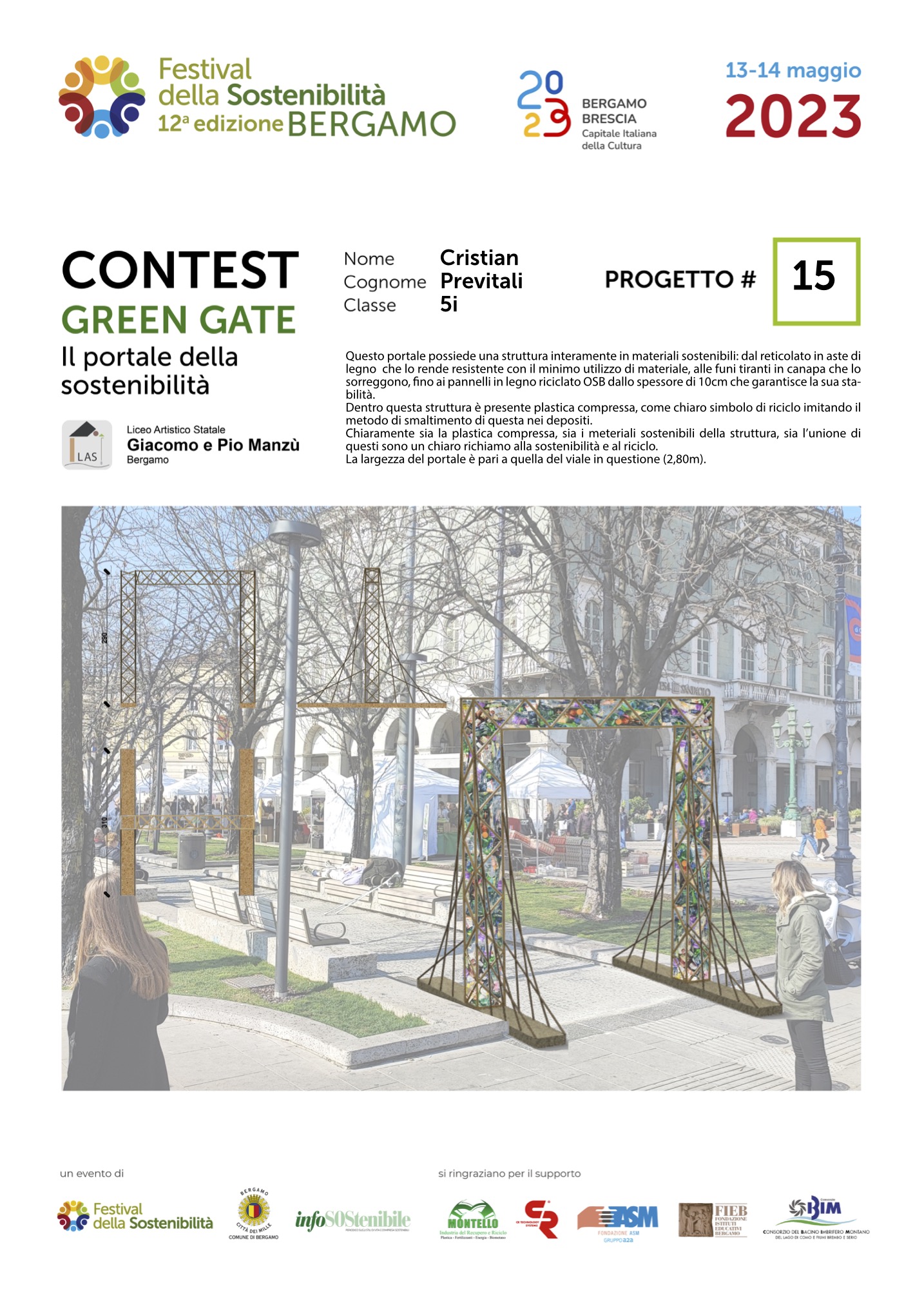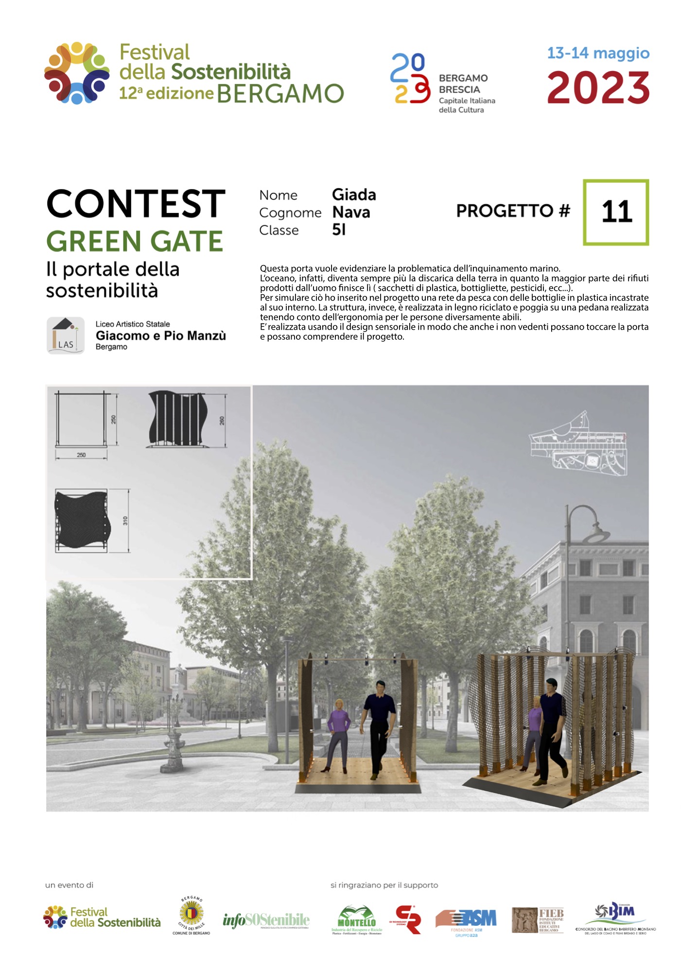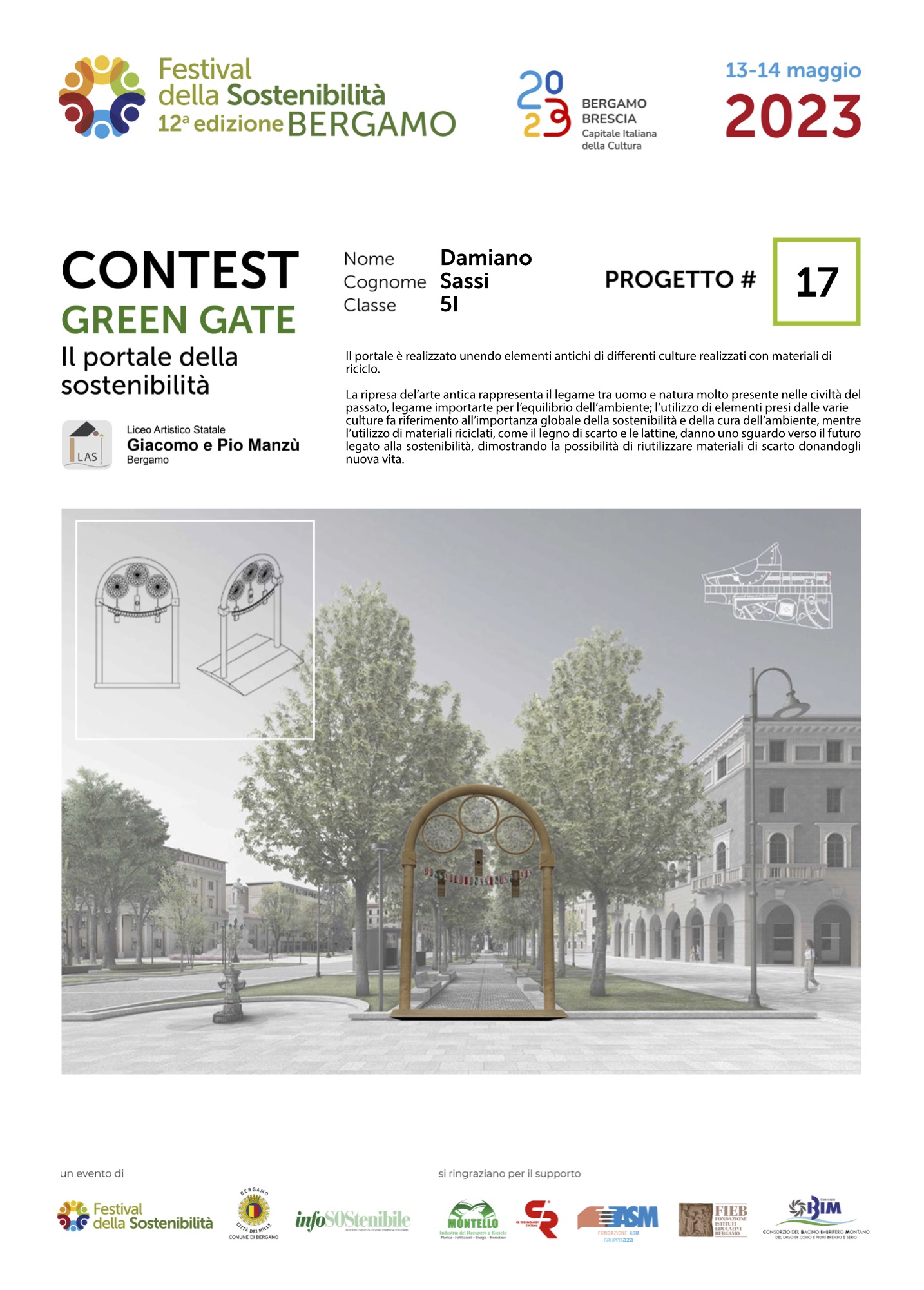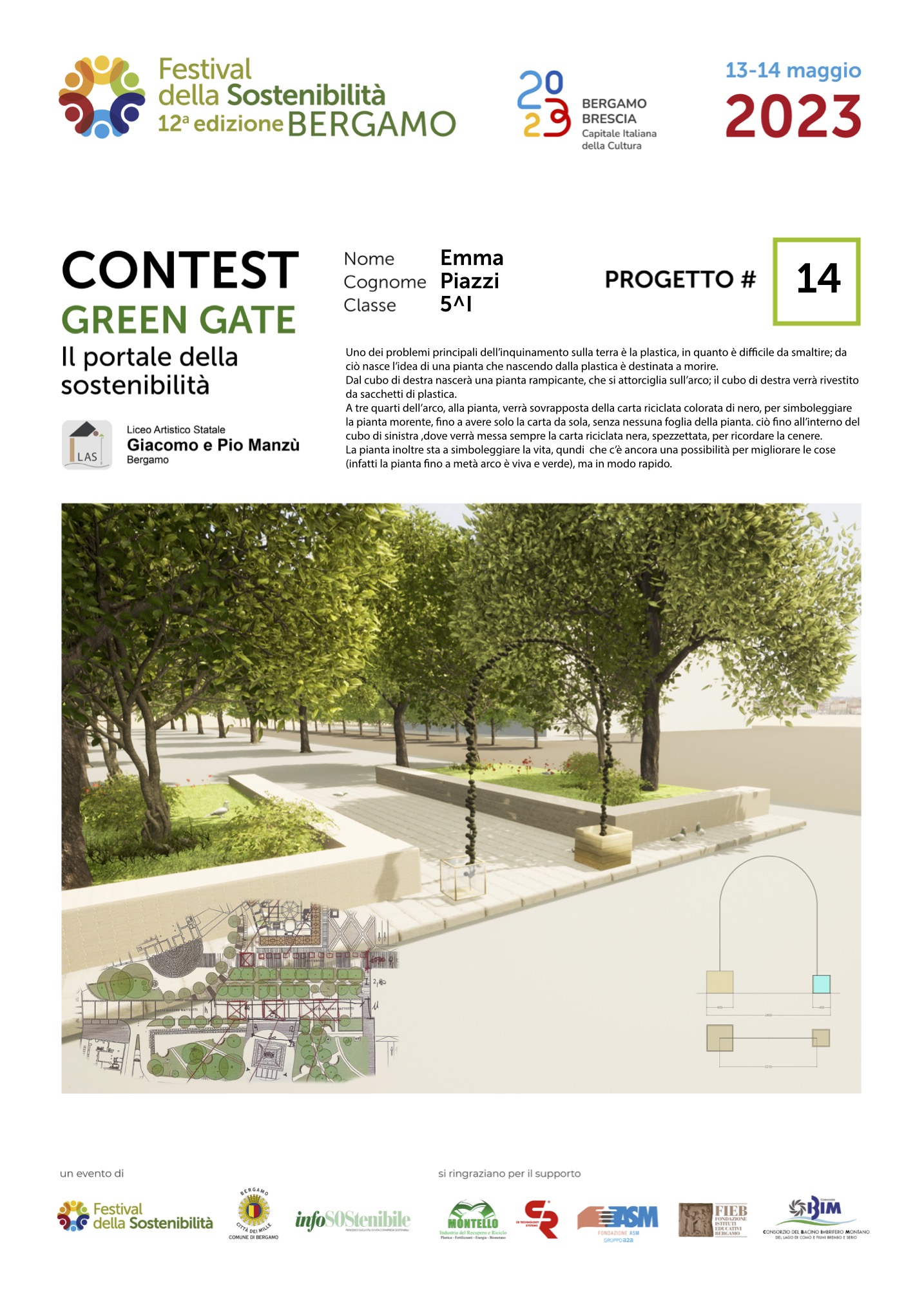 Gli studenti, come dei veri professionisti del settore, hanno concepito ciascuno il proprio Green Gate e, a partire dalla bozza iniziale, hanno sviluppato delle tavole esecutive che riportano la descrizione del concetto su cui si è costruita l’idea, la scheda tecnica e l’elaborato grafico. Le tavole dei progetti saranno esposte lungo il Sentierone durante il Festival e saranno gli stessi studenti a presentarli.