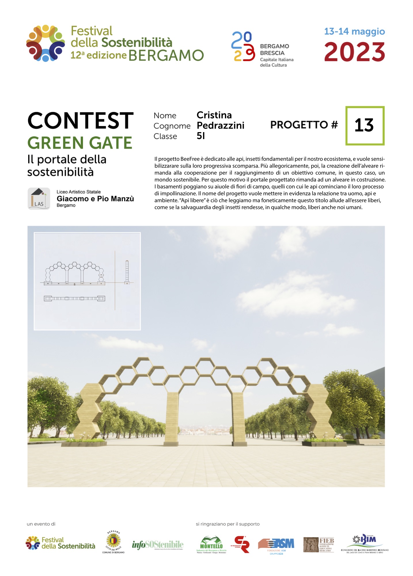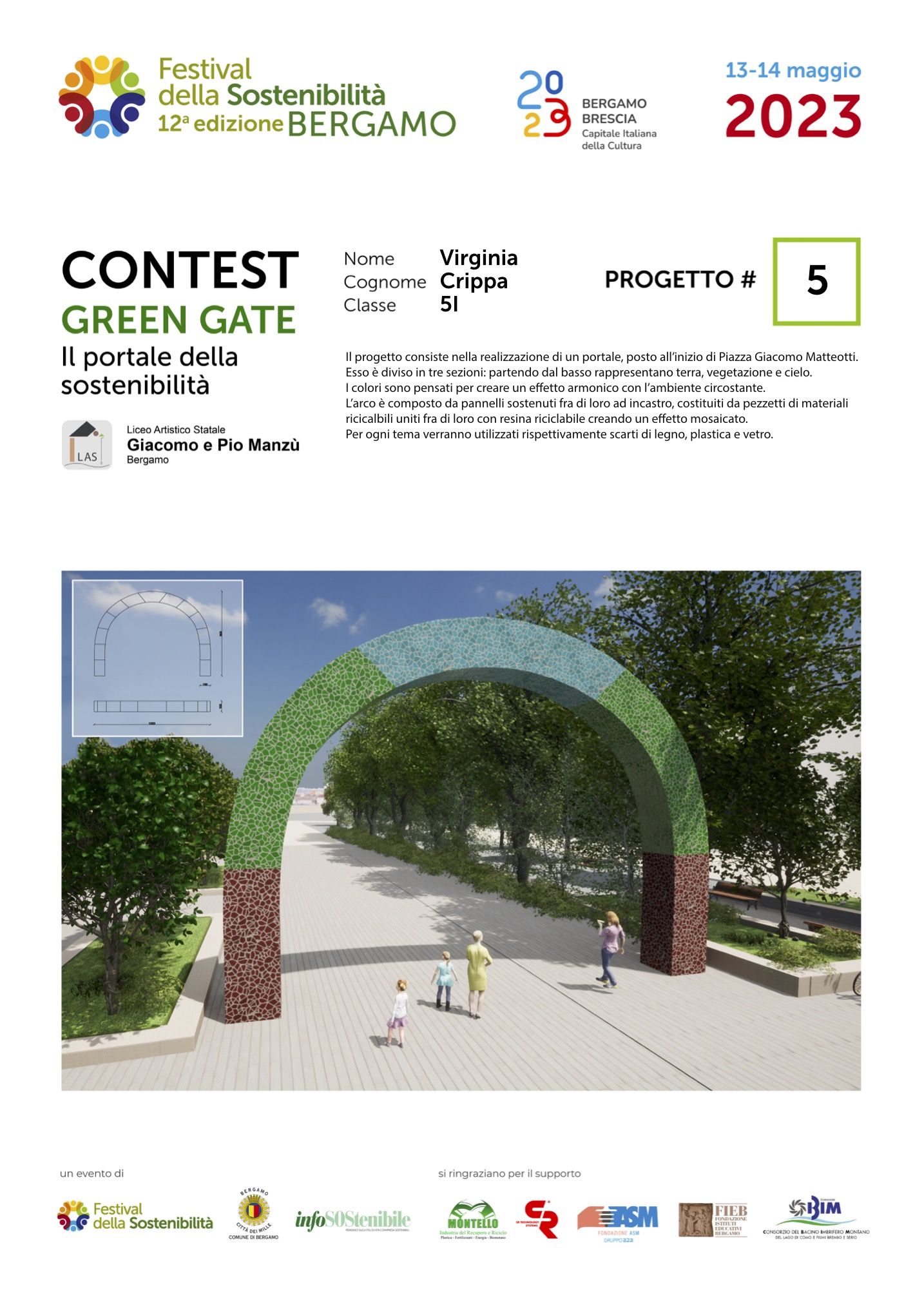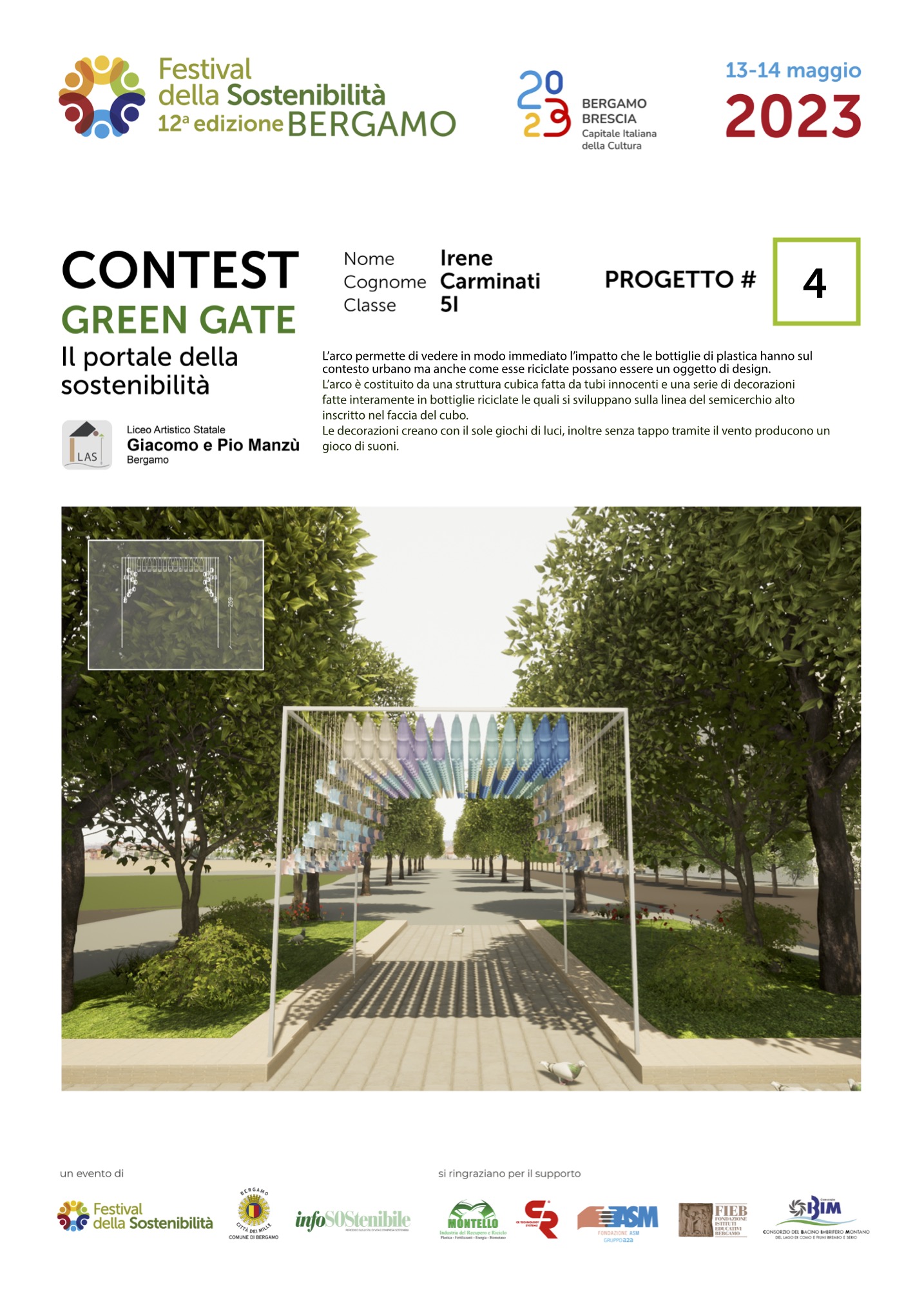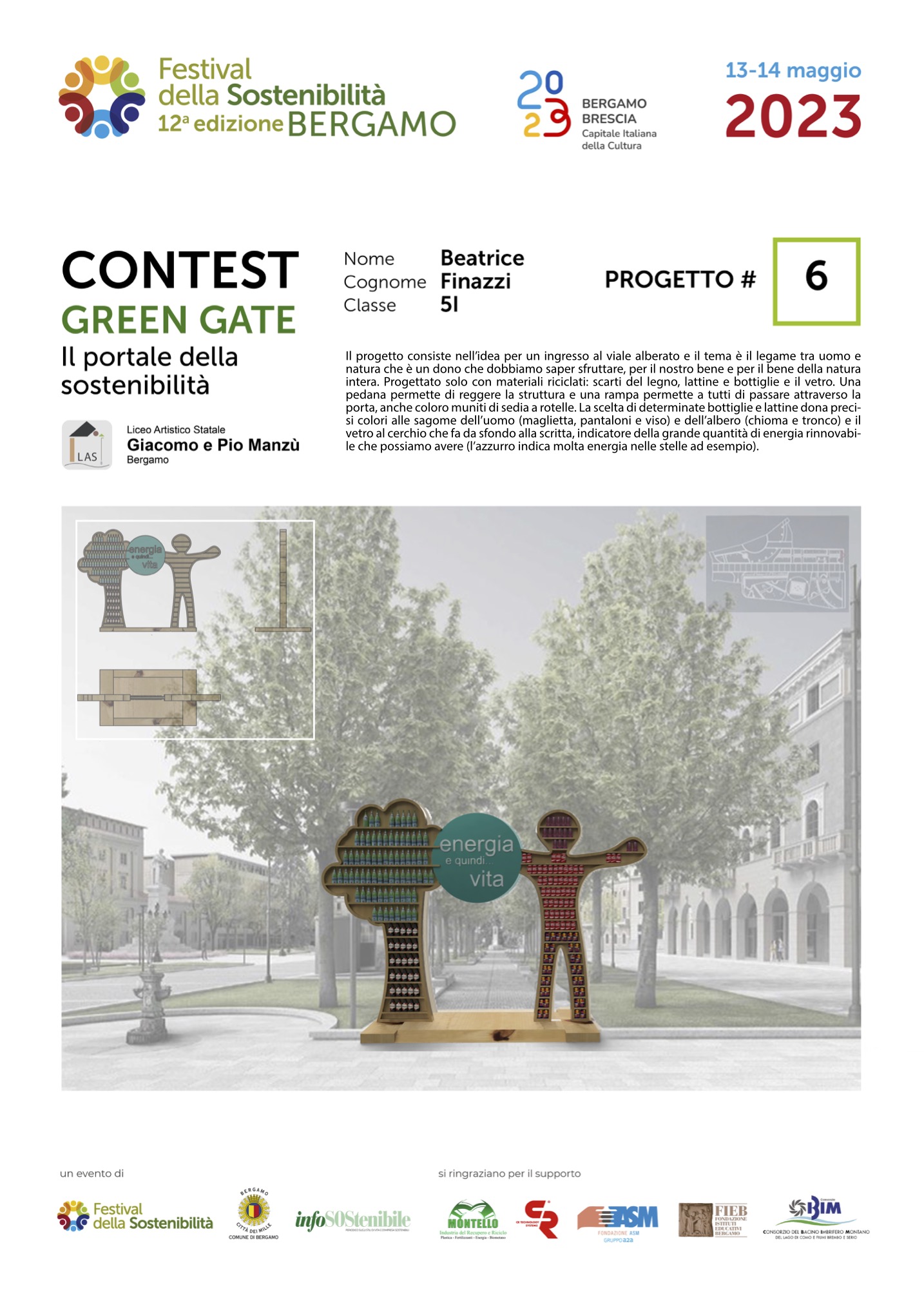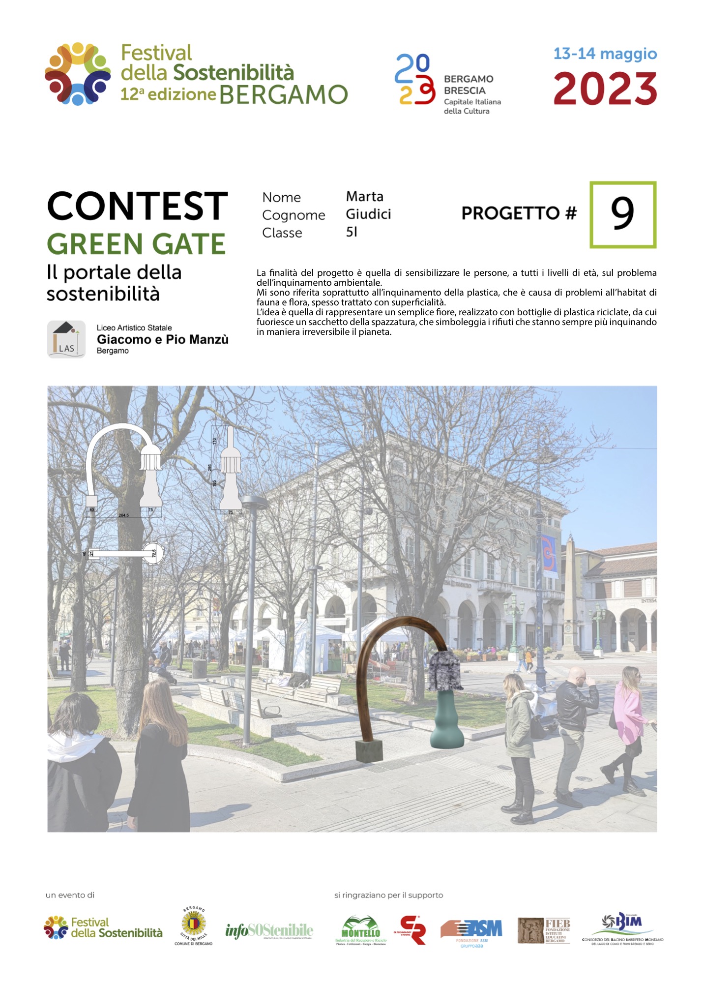 Gli studenti, come dei veri professionisti del settore, hanno concepito ciascuno il proprio Green Gate e, a partire dalla bozza iniziale, hanno sviluppato delle tavole esecutive che riportano la descrizione del concetto su cui si è costruita l’idea, la scheda tecnica e l’elaborato grafico. Le tavole dei progetti saranno esposte lungo il Sentierone durante il Festival e saranno gli stessi studenti a presentarli.
